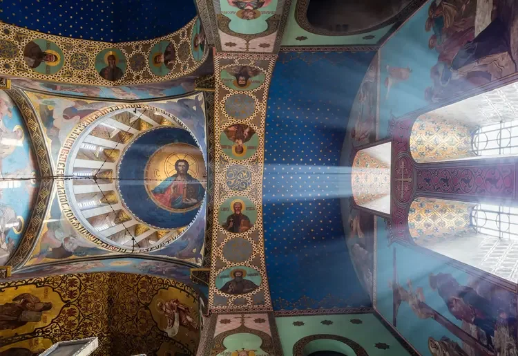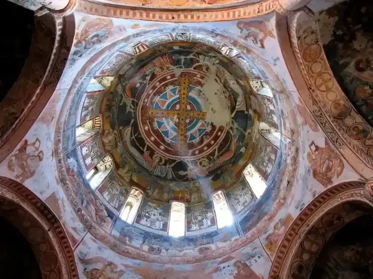 Intricate frescoes spiral upwards and crowd the dome of Gelati Monastery, a remnant of the Georgian Golden Age during which the medieval Kingdom of Georgia reached its pinnacle of power.